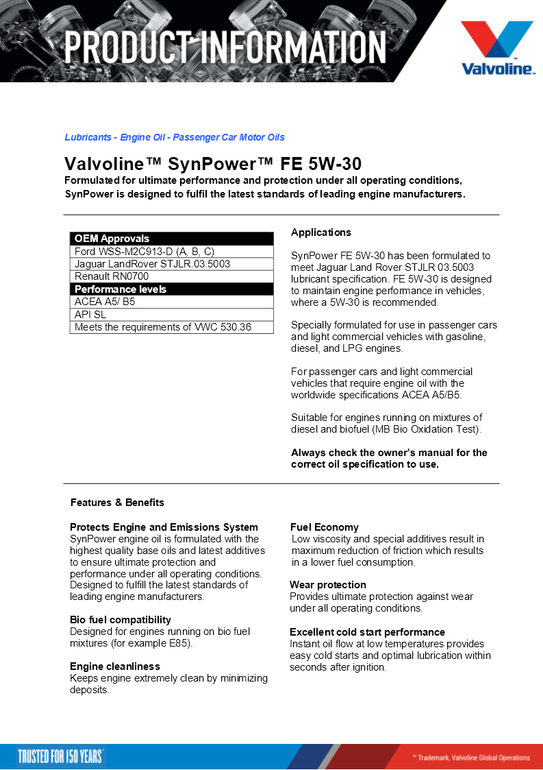 Specially formulated for use in passenger cars and light trucks and vans with gasoline, diesel, and LPG engines. Recommended by Valvoline for Ford engines demanding a Ford WSS-M2C913-D. (Backwards compatible with WSS-M2C913-C and WSS-M2C913-A/B motor oils.